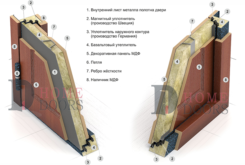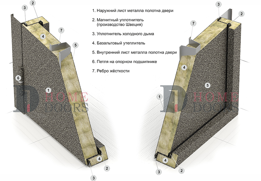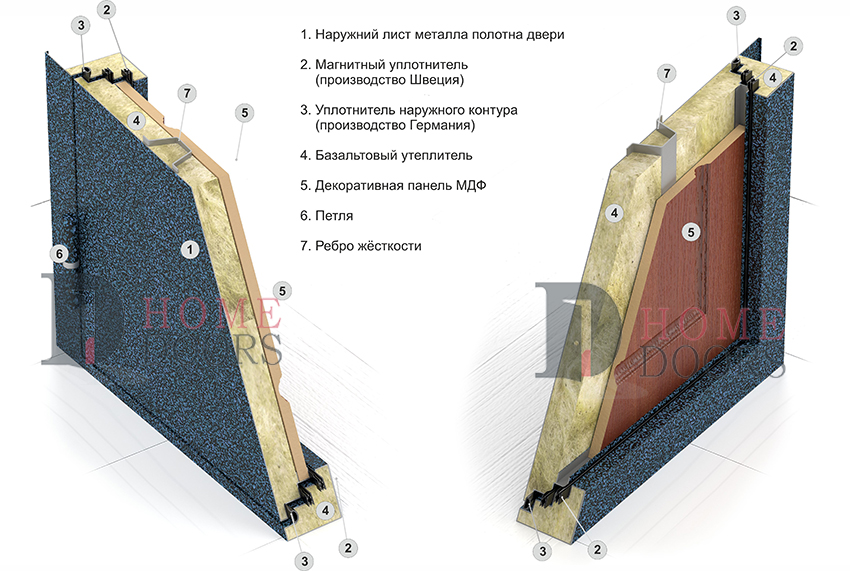 • Для утепления и предотвращения сквозняков и потерь тепла дверные полотна комплектуются утеплителем из минеральных базальтовых плит и тройным контуром уплотнителя по периметру;